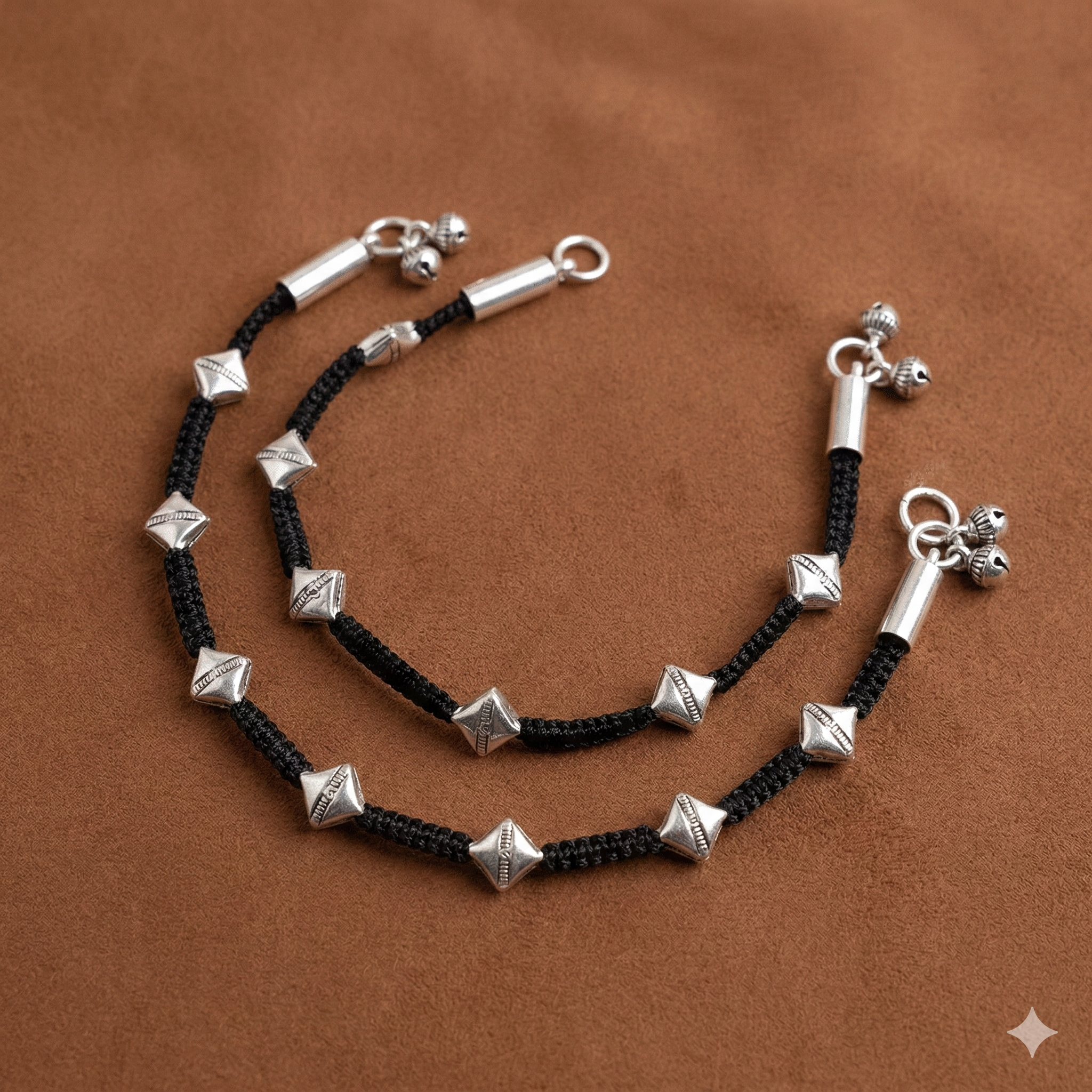 Embrace the beauty of earthy elegance with this handcrafted Black Thread Anklet. Featuring intricately engraved diamond-shaped stainless steel beads strung on a tightly braided black thread, this anklet is a perfect fusion of traditional craftsmanship and contemporary style.
