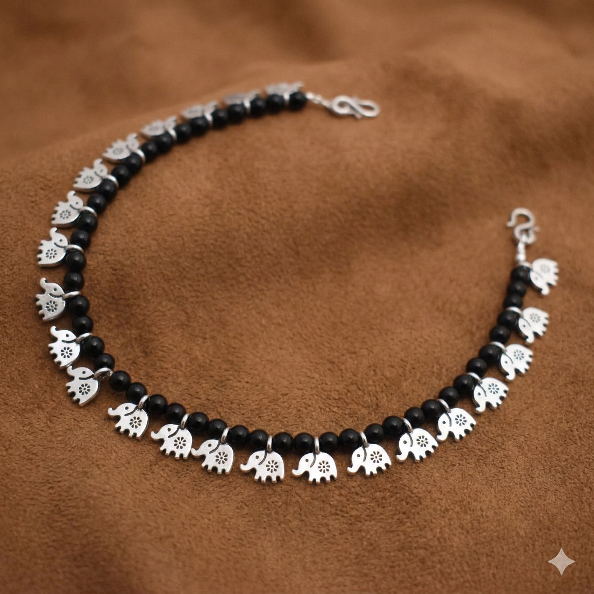Bring home good luck with this elegant Silver Elephant Charm Anklet. Featuring oxidised silver elephant charms with floral detailing and glossy black beads, this boho payal is perfect for ethnic wear, festive occasions, and everyday styling. Adjustable S-hook clasp for a comfortable fit. A thoughtful gift for her!